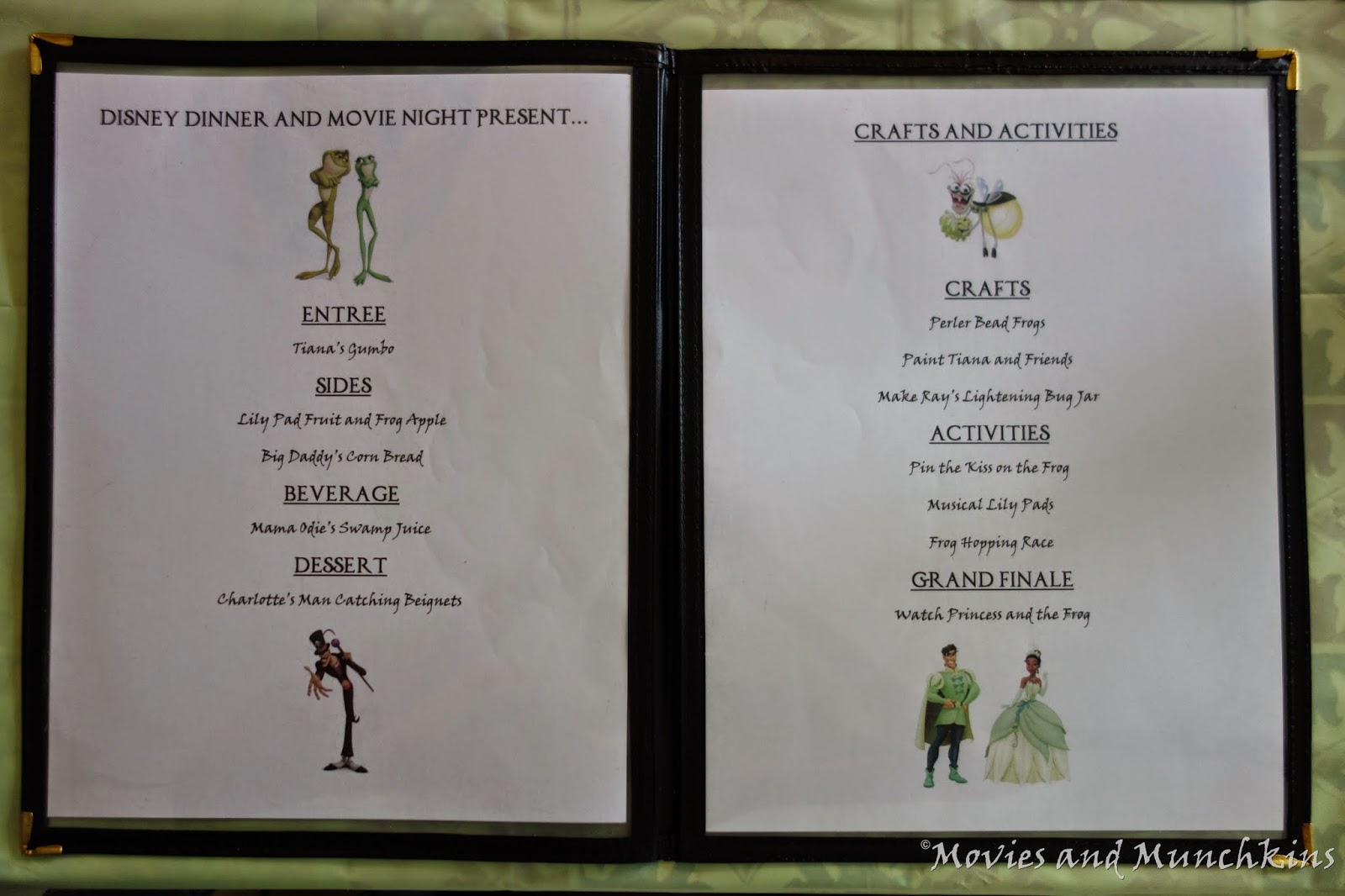I went with a green theme for frogs and also because it's the color of the dress Tiana wears at the end of the movie. I decided to run a blue table cloth down the center of the table to simulate water from the bayou. On the blue table cloth I placed some plastic floating leaves, water lilies, two plastic frogs and a crocodile. (I used an old Crocodile Dentist we had laying around)